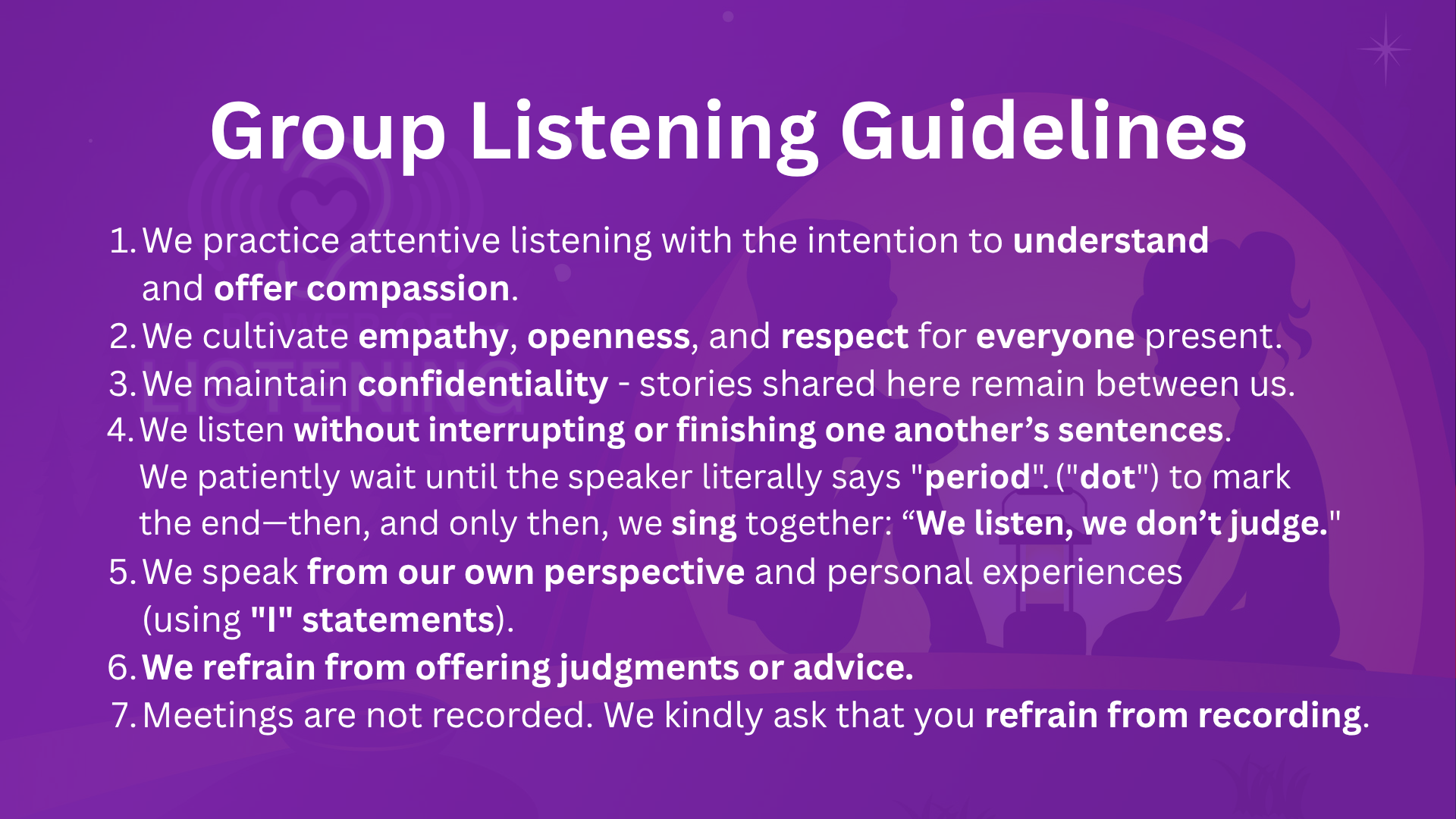 - We listen without interrupting or finishing one another’s sentences. We patiently wait until the speaker literally says “period.” (“dot”) to mark the end—then, and only then, we sing together: “We listen, we don’t judge.”